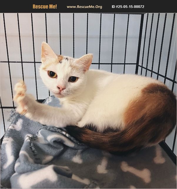 Tink is an adorable short-haired cat with a mostly white coat, accented by a striking calico tail and soft patches of orange and black on her head and back. She has expressive golden eyes and a sweet, slightly curious expression. Tink has been in our shelter since February 2025.