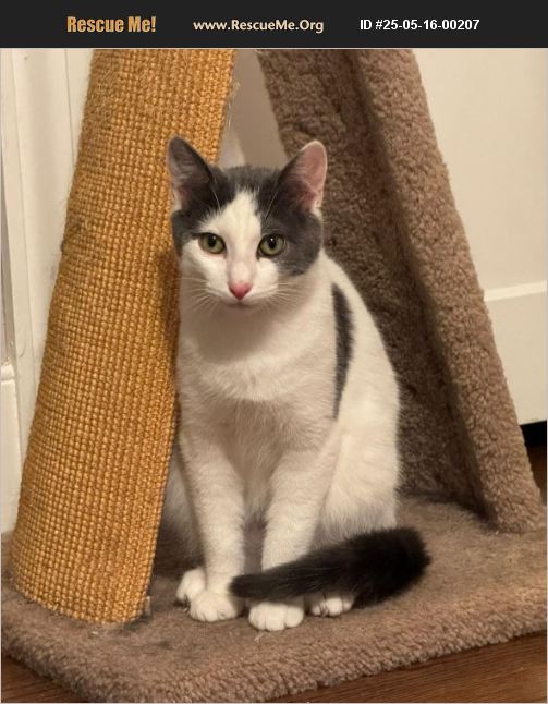 Ajax is a super friendly, high-energy boy-about 8 months old-with a sleek grey and white coat and a need for speed! This little guy is very, very fast, zipping around the house like a furry rocket, always ready for playtime. He's also a total sweetheart who loves other cats and would thrive in a home with a feline buddy to run, wrestle, and snuggle with. Ajax has the perfect mix of playful energy and loving affection. Fully vetted and ready to find his forever home-could Ajax be your new best friend? Fill out an application on our website if interested