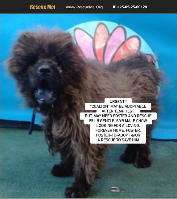 Courtesy Posting: URGENT AT BALDWIN PARK, CA (SO CAL) ID #A5700911 LOS ANGELES COUNTY ANIMAL SERVICES - 'COALTON' MAY BE ADOPTABLE AFTER TEMP TEST, BUT MAY NEED FOSTER AND RESCUE - 55 LB GENTLE, 8 YR MALE CHOW - looking for a LOVING, FOREVER HOME, FOSTER, FOSTER TO ADOPT AND OR A RESCUE TO SAVE HIS LIFE! We are in urgent need of finding a responsible and caring home, or foster and rescue, for this adorable but very neglected, sweet male chow who was found as a stray and brought to the shelter on 5/20. He is expected to become urgent following his stray hold ending on or about 5/25. We are calling him Coalton, and the shelter estimates him to be at least 8 years of age. Despite his very matted black coat that has turned to brown due to utter neglect, this dear boy seems to be so gentle. He can be seen being very calm and gently and happily taking treats in video we have from a shelter volunteer. The shelter said he weighs 55 lbs and came in with a slight limp, so they have given him gabapentin and rimadyl, that seems to be helping. They also did xrays that reveal some spondylosis, so Coalton will likely need to be on gabapentin the remainder of his life for mobility. We understand many dogs with this condition live satisfactory lives, although they may be somewhat limited in flexibility and range of motion. That's okay, as Coalton enjoys just chilling. He also had as crusty nose and fly strike on his ear. A copy of his full medical report may be requested. Coalton is now awaiting his behavior temperament test before he is made adoptable. Hopefully he passes both behavior and medical, or he will be made Rescue only. If Rescue Only, any potential adopters will need to go through a rescue group. And most rescues will either need a foster or a foster to adopt to save him. Therefore, if you may be interested in fostering, fostering-to-adopt, or helping Coalton in some other way (ie., pledging for his rescue), please contact [email protected] or Southern California Chow Chow Rescue Network who is trying to find placement asap, and we can try to pair fosters or interested parties with a willing rescue group. Potential adopters and Rescue groups may contact the shelter directly at: [email protected] and by calling: 626-962-3577 or 626-430-2378 and providing his ID. Coalton's listing link is: https://animalcare.lacounty.gov/dacc-details/?animalId=A5700911&fbclid=IwY2xjawKfdaFleHRuA2FlbQIxMABicmlkETFjY1NzVkFlTUk5d3M5aUtoAR6mF3X--vm8dF_WyrhxZ2gq6ByUBb-Uyc5GhCwSu_CoRoZ9outNSmBm04DLFg_aem_bkjcwduVeI3VocDgNTWWOw We will be posting any additional pictures, videos and updates on his facebook post at: https://www.facebook.com/debbie.alder.14/posts/pfbid0NG1EdvtE8XcwzasQ2nR1GnrieaL27A5uwbxU2ZrpvuCiAMExfUrBMn9QUi7Qp5Kzl Note: to view contents of links you will need to copy and paste each one separately into your browser.