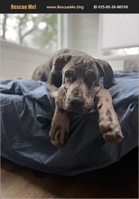 Max is a 1 year old ~130lbs Great Dane that I rescued last year. When I came into his life he was a 15-pound puppy and I was living in Sacramento going through some health stuff. We had an amazing year together but I have now moved back to Yosemite National Park and need to find him a new home with outdoor space and perhaps another playmate. I work in the field and often have to do overnight surveys and Max isn't getting the attention and free space I truly believe dogs should have, so I want to find him a home that can provide him the opportunity to get outside, play with dogs and have a human that's around more often. Max is an incredibly sweet boy that always wants to cuddle, understands and learns commands well, and is good with other dogs. He walks well with a gentle leader and is great on runs but still gets incredibly excited when dogs pass by - he's getting better with humans and doesn't want to jump on them while on leash any more. He's never been aggressive but is still learning not to jump on things, so he wouldn't be a great fit for a family with small children but I imagine once he can be neutered he will calm down quite a bit. In my dream of dreams I would still love to be in Max's life - perhaps say hi to him when I pass through your town or take care of him when you go on vacation, but ultimately know that finding him the best home is more important than my sporadic visiting or caretaking. If you think you are a good fit please tell me a bit about yourself, your home and your lifestyle. I really want Max to have the best life possible.