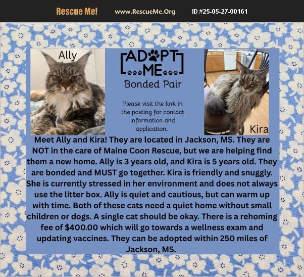 **This is urgent!** **THIS IS A COURTESY POST** THIS IS A COURTESY POST CAT WHO IS BEING CARED FOR BY OUR FRIENDS AT OTHER RESCUE GROUPS/SHELTERS, OR IS A PRIVATE PARTY NEEDING TO REHOME THEIR CAT. FOR INFORMATION ON THIS CAT, PLEASE DIRECTLY CONTACT THE PERSON NAMED BELOW. Meet Kira and Ally. They are a BONDED PAIR of Purebred Maine Coon girls who are looking for a new home. Kira is around 5 years old, and Ally is around 3 years old. Kira is a snuggly and friendly girl. She is very sweet. Kira does not always use the litterbox. It is thought to be the home environment she is in. She will be checked out by a vet before going to a new home. Ally is quiet and cautious. She does not like loud noises or households. Ally and Kira should be in a quiet home without dogs or small children. They would be maybe okay with a single cat or older children. There is a rehoming fee of $400.00 to ensure they are going to a good home. For more information, please contact Catherine at: [email protected]. Age (approx): 3 & 5 Location: Jackson, MS 39211 Available for Adoption: NOW