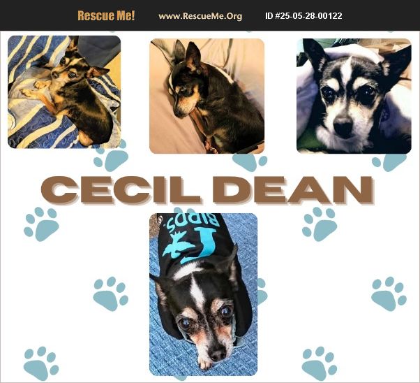 ��ժ��%90%BE Meet Cecil Dean - Your New Snuggle Buddy! ��%90%BE��ժ Looking for a loyal companion with a giant heart in a tiny body? Meet Cecil Dean, a 12-year-old, 5-pound Chihuahua who's mastered the art of cuddling and stealing hearts! This little guy lives for cozy naps in your lap and movie nights snuggled by your side. In classic Chihuahua fashion, his personality is four times his size - and it just makes him even more irresistible! Cecil Dean is dog-friendly and totally unbothered by cats. His favorite pastime? Eating. And don't be surprised if he gives you those big, soulful eyes to convince you it's time for a snack (again). ���� When Cecil first came into foster care, he was battling a severe infection from neglected dental care, which caused a heart murmur. After antibiotics, a much-needed dental (including a few extractions), and starting a tiny daily medication, he's feeling so much better! He now takes just 0.25 of a small pill twice a day to manage the murmur. He may have early cataracts, but you'd never know - it doesn't slow him down one bit. Cecil Dean is full of life, love, and ready for a home where he can be spoiled, adored, and cherished like he deserves. ���� If you're ready to open your heart and home to this sweet senior, apply to adopt today. Cecil Dean is waiting to spend the rest of his golden years loving you.