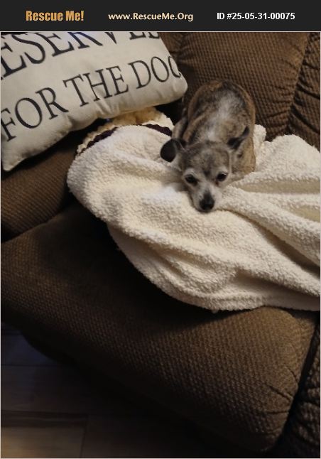 Beautiful brindle 8#, 7 year old gal. If you are looking for a couch companion, she's your gal. If you are looking for a walking companion, she's your gal. Easy keeper. Loves to sit next to you. Sleeps in her crate at night, all night. Housetrained. Up to date on rabies vaccine, heartworm meds and flea prevention. She had a bad time while in a shelter as 6 other dogs were in the kennel with her and they were all bigger, so she is not a fan of other dogs. She is healthy and knows some commands. A love bug! Comes with her beds, food, and toys, which she absolutely loves.