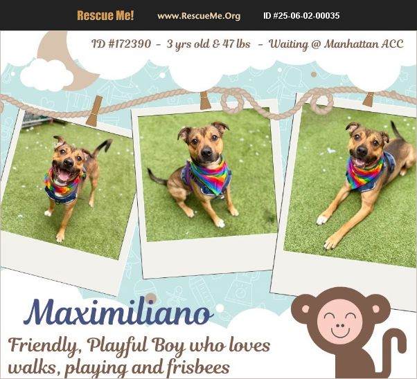 Meet Maximiliano - A Loving, Energetic Companion! ��%BD��%BD%90 Why You'll Love Maximiliano Affectionate and Social with People: Max loves pets, snuggles, and bonding time. He has a friendly, playful nature and seeks companionship from trusted humans. Great with Familiar Faces: He forms close connections and enjoys being with people he knows. Kid-Friendly in Former Home: Previously lived with children and was reported to be relaxed and gentle. Smart and Eager to Learn: Knows sit, stay, and paw; thrives with mental stimulation and will benefit from continued positive training. Tolerant of Handling: No issues with grooming, vet checks, or being approached by unfamiliar people. ��%BD��%BD��%BD��%BD What the Shelter Says 'Max loves pets and - you guessed it - snuggles! He's ready to learn and needs a patient person to help him thrive. He'll flourish with someone who can commit time, structure, and love.' ��%BDs%A0��%BD��%BD%8F Special Needs & Best Fit Maximiliano is best suited for: ��%BD�%A4��'��%BD%8D��%BD��%BD��%BD%BC Experienced, Adult-Only Homes: He needs someone confident and dog-savvy to work with his behavioral needs. ��%BD��%BDs��%BD No Other Pets: Max is highly reactive toward unfamiliar dogs and cats. ��%BD��%BD%90%BE Structured Environment: He would benefit from training with a certified behaviorist or trainer, particularly to address: Leash biting Dog reactivity Excitability and frustration ��%BD�%A4%A0 Daily Enrichment & Exercise: High-energy pup who needs both mental and physical stimulation (toys, puzzle feeders, and engaging walks). ��%BD��%BD��%BD Force-Free, Reward-Based Training is essential. ��%BD��%BD��%BD Medical Status Healthy & Ready for a New Start! No known medical issues (other than a chicken sensitivity). Cleared as OK for surgery (not yet neutered). ��%BD��%BD%90��%BD Let's Help Max Get His Second Chance With the right person or rescue, Maximiliano has the potential to grow into a loyal and loving companion. He's waiting for someone who can see past his current challenges and help him shine. Previously lived with:: Adults, children and a kitten How is this dog around strangers?: Friendly How is this dog around children?: Relaxed and playful. Tends to play gently. How is this dog around other dogs?: familiar dogs: playful unfamiliar dogs off leash: hard barks and growl unfamiliar dogs on leash: hard barks and growls How is this dog around cats?: hard barks/growls Resource guarding:: None Bite history:: None Maximiliano ID #172390 Male brown dog At the Manhattan Animal Care Center About 3 years 4 months old Weight: 47 lbs An owner surrender on 5/24/2025, with the surrender reason stated as person circumstance- moving - no pets allowed. Status: New Hope Partner Placement Only