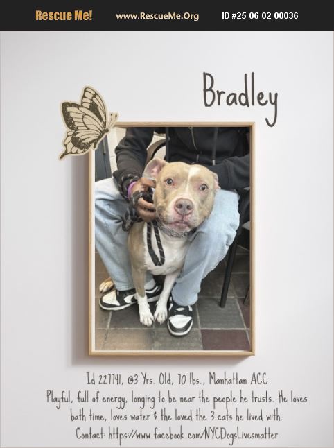 His owner loved 'how he lays around all day and how he is scared of everything and everyone.' But now that may result in this poor kid losing his life! Bradley is not broken. He is simply a dog who has never been taught the world is safe. He was failed-not just abandoned but left unprepared for life outside the only home he knew. He was sheltered, but not in the way he needed. No training, no socialization, just love that wasn't enough to make him brave. Now, fear is his constant companion, and that fear might cost him his life. But Bradley has good in him. He is playful, full of energy, longing to be near the people he trusts. He loves bath time, loves the water, loves lying in the bedroom, close but never demanding. And despite his fear, despite his uncertainty, Bradley was wonderful with the cats in his home-gentle, outgoing, comfortable in their presence. That means there is hope. Somewhere inside, he knows how to trust. He just needs someone willing to show him how to do it with the rest of the world. Bradley does not need perfect. He needs patience. He needs structure. He needs someone willing to guide him, to give him the confidence he was never taught to have. The right person can save his life-not just from the shelter, but from the fear that has been allowed to shape him for so long. He is waiting for that person. Bradley is a 3 year old male large mixed breed dog. His owner is surrendering him due to being unhoused for the moment and moving into a temporary home. Bradley lived with 2 adults. 2 children and 3 cats. He hard barks and/or growls at strangers and children. He hard barks and/or growls at familiar dogs. He hard barks and/or growls at unfamiliar dogs both on and off leash. Bradley hard barks and/or growls to stray cats outside, but with the cats from his home, he is friendly and outgoing with them. BRADLEY, ID# 227741, @3 Yrs. Old, 70 lbs., Male Manhattan ACC, Large Mixed Breed, Tan/White Owner Surrender Reason: 5/23/25 - Housing insecurities Behavior Assessment Rating: New Hope Only Recommendations: No children under age 13 Place with a New Hope Partner Medical Behavior Rating: