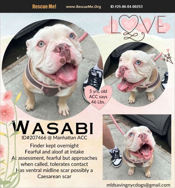 Wasabi is cute, chaotic, and absolutely unforgettable! This sassy little bulldog pup has a whole lot of personality packed into her compact frame-and she knows it. All she wants is a home where she can be spoiled like the princess she is, soak up the sun, and rule your heart (and your backyard)! ��%BD��%BD��%BDz��%BD��%BD��%BD��%BD��%BD��%BD��%BD��%BD #WasabiWiggles #SpicyBulldog #AdoptWasabi #RescueRoyalty #SoloDogLife #BulldogEnergy #AdoptDontShop A volunteer writes: Wasabi is a perfect name for her because she sure is a spicy little bulldog! She's got attitude for days, probably because she's used to getting what she wants since she's so stinking cute. And honestly, Wasabi SHOULD get anything her little heart desires because she's really just a baby. Her FAVORITE thing to do is laze around in the yard, and she LOVES toys, so the ultimate afternoon involves playing a bit and then snoozing in the sun with her head resting on her plushy like a pillow. But sweet princess puppies who are used to being catered to don't do well in the shelter where they aren't getting the utmost attention. Wasabi has been known to chew on her leash (maybe she is just trying to file down that underbite) and she's been reactive toward other dogs. Wasabi was initially at our Manhattan shelter last summer, adopted and now found stray by a good Samaritan. She'll do well with a family that can devote a lot of time and patience to her, let her acclimate on her own terms and at her own speed, and with no other dogs. WASABI@QUEENS ACC Wasabi ID#207466, 5 years old, 46 lbs Medium Mixed Breed, White Spayed Female Came into shelter as a Stray ��%BD'��%BD��%BDMedical Behavior Evaluation: 2. Blue Behavior Evaluation Rating: NHO INTAKE DATE: 5/10/2025 Finder reported that Wasabi barked and lunged at other dogs while walking her around in an attempt to find her possible owner.