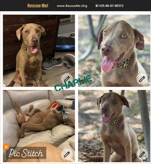 Seeking a home for Charlie the rescued starved weimer Reiner details below located canyon lake tx contact Sunni Patrice Stalbird 830 237 8588 Some before and afters. He gets along with other dogs and is available immediately. He's been cleared by the vet , getting neutered June 18 Here's his stats and story: Name: Charlie Gender: Male Age/weight: 9 mos./27.6 lbs. Breed: Weimaraner/Terrier Mix Heartworm status? On prevention?: No heartworms/Yes-Simparica Trio Up to date on vaccines? Yes - Has had rabies & distemper vaccines Medications/Injuries? Spayed/Neutered?: Cleared of hookworms and coccidia. Currently finishing prednisone, Proviable (probiotic) and Ayradia (antibiotic)-these are all to continue strengthening Charlie's system Good with: men, women, dogs, cats; has had limited exposure to children House trained? In progress-prednisone is complicating by increasing urination, but he is learning quickly Crate trained? Yes - able to relax in crate Energy level in house? Rising every day! Energy requirements? Will need walks and playtime as he grows stronger-we can already see the puppy spirit in him! Travel well? Yes-good with 10 min-1 hour car rides Favorite toy/activity? Being with his humans and starting to like crinkly toys Leash trained? In progress-still some work to be done What food has your dog been eating? No aversions yet to anything-he has been on digestive health Royal Canin dry and wet food, and has also enjoyed boiled/baked unseasoned chicken Any cute personality traits or quirky anecdotes to enhance their Petfinder profile? He has shown himself to be a BIG fan of being around his humans and pet pack (dogs and cats). When you're his human, he will stay close to your side. He loves exploring and sniffing out his environment, but when he gets tired, you can pick him up and sit him beside you on the couch and he will doze off. He has also loved being around food-something he didn't have for most of his life-and has been standing on his hind legs to check everything out��%BD'��%BD|and to reach things if he can! Charlie's Story: We'll never know all of Charlie's story, but for his foster humans, the story began with Foster Mom Nicole driving home from work and seeing three gangly, emaciated puppies, wandering alone at an abandoned RV parking spot. Two of the puppies never let Nicole get close to them, but the third puppy did, mostly because he was too weak to run-Nicole named him Charlie and brought him back to her house. A wonderful local veterinary office, Bay Breeze Animal Clinic, treated Charlie, diagnosing him with hookworm, coccidia, and malnutrition-the office dated him nine months old, weighing just 19 pounds. His future was not bright. Charlie never stopped believing in people though. As sick and weak as he was, he always wagged his tail for his foster family and watched them with his beautiful light eyes. By the time of his two-week follow-up, Charlie had gained eight pounds, was standing and walking faster by the day, interacting peacefully with other dogs and cats, and was feeling well enough to act like a puppy again. Charlie has had a harder life than he ever should have had. What he needs is a loving household where human parent/s can help him get stronger, learn how to play, finish his potty training, and give him the love and attention he's missed for nearly his entire life. He's a little cautious with some new people, but considering what he's been through, the fact that he warms to them as quickly as he does is impressive. It is so evident that Charlie is a bright, sweet, loving puppy-he is an absolute treasure.