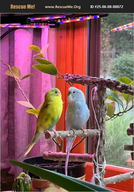 2 Parakeets, Sunshine (yellow) and Snowy (Blue). Yellow is female and Blue is Make. They come with beautiful cages and toys. They fly together and sleep together. Looking to home them with a loving environment.