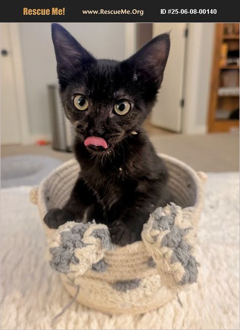 Billie is a sleek, black kitten with a big heart full of love to give. From the moment he spots you, Billie turns on the charm - purring like a little engine and weaving around your legs for attention. He's all about the cuddles, whether he's curled up in your lap, perched on your shoulder, or snoozing on your chest like he owns the place. In the right light, you can see tabby stripes in his handsome black coat. Affectionate and irresistibly endearing, Billie has a way of making everyone feel like his favorite person. He loves being held like a baby and might even reach up to gently pat your face with his tiny paws-just to remind you he's there and in love with you. Belly rubs? Yes, please. Face kisses? Absolutely. He's your loyal sidekick, always ready for snuggles. But don't be fooled-Billie has a spunky side too! He's full of kitten energy and adores chasing toys, wrestling with his siblings, and zooming around the room in gleeful bursts of energy. Because of his playful nature, Billie requires another young, playful cat in the home-or he'd LOVE to be adopted with one of his siblings, Bellbottom or Bonsai. Billie is a social butterfly who gets along well with other cats, kids, and would likely do great with a gentle dog. He's confident, curious, and quick to adapt to new surroundings and new friends. He's fully litter trained and has received all his necessary vet care, including vaccinations, disease testing, and a clean bill of health. If you're looking for a kitten who's equal parts cuddlebug and mischief-maker, Billie might just be your perfect match. Come meet him-you won't want to leave without him.