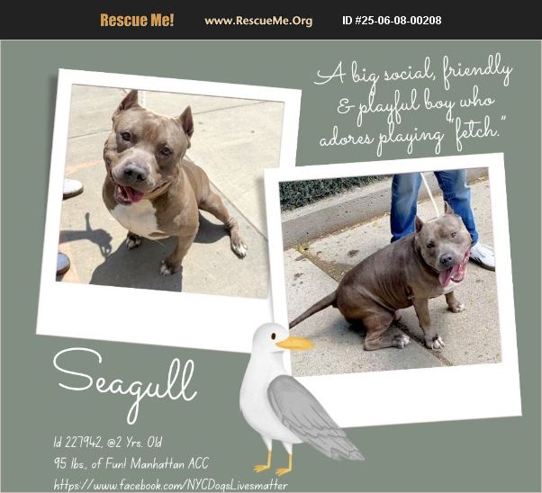 Seagull's Id is 227534. We are sorry for the error. He was found all alone in the streets of the city when a Good Samaritan took him to MACC. He was understandably overwhelmed after his ordeal of being lost and/or abandoned and didn't know who to turn too. But now he is playing ball and boy oh boy, does he ever love the game of fetch! He is good at it too, running full throttle despite his chubbiness, and he brings the ball straight back to you, eager for another throw. And if you don't stop, he won't either! He's all in. Seagull is still getting his sea legs, and though he has been reactive on leash to dogs and people, off leash at the shelter when he met another dog he was all warm welcomes and wiggles. We'd love to see him out of there sooner rather than later so he doesn't end up on the dreaded list! Please share Seagull far and wide for an experienced family who can give him the calm, quiet home he needs to decompress and then warm to a new life where he will be cherished - hopefully with sacks of tennis balls! SEAGULL, ID# 227534, @2 Yrs. Old, 95 lbs., Male Manhattan ACC, Large Mixed Breed, Gray/White Surrender Reason: 5/20/25 - Stray Behavior Assessment Rating: New Hope Only Recommendations: No children under age 13 Place with a New Hope partner Medical Behavior Rating
