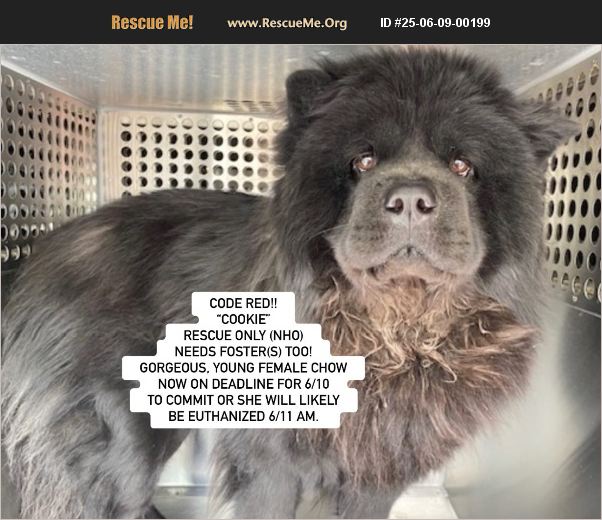 Courtesy Posting: CODE RED AT MESA (nr PHOENIX), AZ! ID #A5145527 -MARICOPA COUNTY ANIMAL CARE, EAST LOCATION- RESCUE ONLY (NHO) - NEEDS FOSTER(s) TOO - 'COOKIE 'a gorgeous, young female chow. NOW ON DEADLINE FOR 6/10 TO COMMIT OR SHE WILL LIKELY BE EUTHANIZED 6/11 AM. SHE IS 'RESCUE ONLY' BY A 'NEW HOPE PARTNER ONLY' which means she can NOT be adopted from the shelter directly, and New Hope partner must pull her out. Therefore, since rescues need a place for a dog to go, WE NEED A CHOW SAVVY FOSTER or FOSTER TO ADOPT AND OR A RESCUE TO SAVE HER IN TIME. pls contact Robin with questions or interest, as shared posts and comments may not been seen Emergency/soon to be euthanized! We are in urgent need of finding a chow savvy foster, or at least a foster familiar with similar breeds. Now named Cookie, she came in as a stray and was misunderstood as a chow. We have sweet videos of her from a volunteer though we can share, or are posting on Facebook. Despite this, we are told, 'I'm just 2 years old, a 56 lb black Chow Chow, and I don't understand why I'm here. Everything is loud, unfamiliar, and terrifying. I lie frozen against the kennel wall. When people approach, I don't bark. I don't growl. I just�'�| shut down. When handlers come near, my body tenses, my eyes widen, and I try to disappear into the floor. Sometimes I cry softly when they touch me, not out of aggression-but out of fear. I don't know if I'm safe here. They say I pace along the fence line when I'm in the yard, always looking for a way out. I sniff the treats they offer, then walk away. I don't want food. I want peace. I want safety. I want to be invisible until someone finally sees me. Once, I licked a handler's hand. Once, I sat down in the corner of the yard and let myself breathe for just a second. There is still a tiny flicker of trust inside me. But the longer I stay here, the dimmer it gets. Please�'�| I need a quiet foster, with someone patient who won't expect me to be perfect right away.' A complete list of shelter notes can be found on the portal: https://apps.pets.maricopa.gov/pri.../Details/OTI2-MTk0-ODZB We are therefore looking for chow savvy homes to foster or foster to adopt her. If you may be interested in fostering, fostering to adopt, or helping in some other way (ie., pledging for her rescue), please email: [email protected] asap at Southern California Chow Chow Rescue Network who is trying to find placement asap, AND also fill out a foster application on https://azfosters.com/ so both entities can work on pairing a foster to a rescue group to help. Rescues can assist with spaying. Rescue groups may contact the shelter directly at [email protected] and by calling 602-506-7387 and providing ID. Cookie's facebook post with updates and videos is: https://www.facebook.com/783968124/posts/10167204802083125/?mibextid=wwXIfr Note: to view contents of links you will need to copy and paste each one separately into your browser.