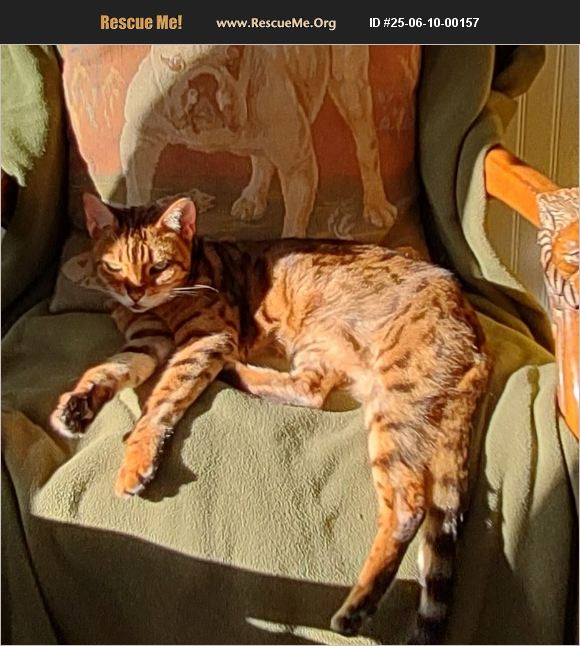 She is a delicate, slim, declawed in front, sweet, loves being petted when she is eating, in my bed at night, when she comes up against my legs, but does not like getting picked up, nor is she a lap cat. Very much likes laying in sun. Uses litter boxes mainly for pooping, but urinates mostly on pee pad in front of litter boxes, sometimes in box. Has no interest in cat toys, light beam occasionally. overgrooms when my dog makes her nervous. lays on cat tree and round cozy bed.