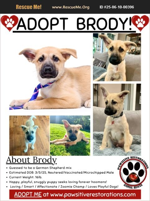 ��%BD��%BD��%BD��%BD Meet Brody! ��%BD��%BD��%BD��%BD 3-month-old Shepherd mix | Velvet-soft fawn coat | Professional goofball If sweet, silly, and snuggly had a baby-it would be Brody. This handsome pup is all about zoomies, cuddles, and making you laugh with his hilarious puppy antics. He's got the world's cutest eyebrows, a heart full of love, and a knack for mischief (don't leave the snack bag unattended, you've been warned). Brody is friendly, affectionate, and so ready for adventure. He LOVES other dogs, plays beautifully, and would thrive with a furry sibling and a yard to explore. He's working hard on potty training, still learning to like the crate (he's got big opinions), but makes up for it with every tail wag, cuddle, and joyful bounce. He's equal parts snugglebug and party animal, and once you meet him-you'll wonder how you ever lived without him. *** Go to www.pawsitiverestorations.com to learn all about our dogs, watch their silly videos, read our adoption process, and to submit an adoption application. Inquiries made on this site will not be seen! Visiting our website will answer all of your questions. Thank you! ��%BD��%BD%90 ��%BD��%BD%90%BE