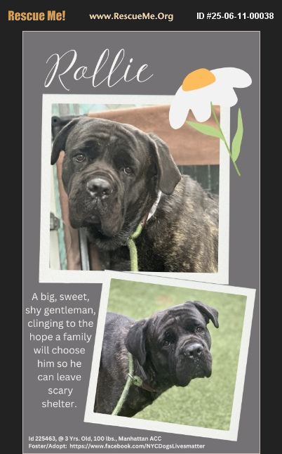 This big, beautiful boy with the sad, lonely face is ROLLIE. He was given up by his family because of behavior -- behavior born fear and lack of confidence, and something that an experienced large dog owner is able to handle with patience, positive reinforcement training, constant repetition, and an understanding that when a dog is feeling unable to handle social situations, they look to their owner for guidance, stability and structure. Poor Rollie is struggling to overcome his feelings of loss and abandonment, not by just one family, but also by his adopter of exactly a day. Understandably, being bounced around from home to shelter to a home back to the shelter is challenging for any dog, but especially challenging for Rollie who is a sensitie soul. Rollie needs an experienced family and a home where he can feel at peace. He has done well with some handlers at the shelter who took that time to go slow with him and let him warm at his own pace and approach them in his own time. He leans in for pets, and enjoys the human contact and comfort. Please share Rollie for the experienced family he never had. ROLLIE, ID# 225463, @ 3 Yrs. Old, 100 lbs., Male Manhattan ACC, Large Mixed Breed, Black Brindle Adoption Return, 6/1/2025, Behavior, one day Original Owner Surrender Reason: 4/23/25 - Behavior Behavior Assessment Rating: New Hope Only Recommendations: No Children under Age 13 Medical Behavior Rating: 4. Orange Rollie greets another dog at the gate with a neutral body, high wagging tail. He disengages on his own and will reapproach remaining neutral.