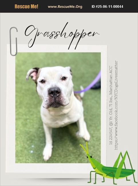 Grasshopper has been waiting-waiting since early April, his heart full of hope, his paws always ready to greet. He isn't just another shelter dog; he's a social, affectionate soul who thrives on companionship. He's the kind of pup who gently paws at his handler's knee, asking for more love, the kind who carries his toy proudly, eager to share his joy. And when he sees another dog? He lights up, his tail wagging, his body soft and welcoming. He's great with other dogs, eager to connect, eager to belong. But shelter life is wearing him down. He's starting to deteriorate, longing for a home, for someone to step forward and show him the kindness he so freely offers. He's sweet. He's playful. He's worth saving. Grasshopper just needs a chance-could you be the one to give him the future he deserves? WHAT MY FRIENDS AT ACC SAY ABOUT ME: My history is a mystery and my friends here do not know much about me yet. I love getting pets and - you guessed it - snuggles! I'm ready to learn! I need a patient person who has the time to work on training with me. I would do best in a home without very tiny humans, although I could be open to older children once I meet them. I have Movies! Grasshopper https://youtu.be/hDEaCmf0Zo8?si=BnDWHw0KgKqxWHgD Grasshopper is a social and confident boy! https://youtu.be/vMMJiLjy0TA?si=haIjs90umkwV3cUF GRASSHOPPER, ID# 224547, @1 Yr. Old, 71 lbs., Neutered Male Manhattan ACC, Large Mixed Breed, White/Brown Brindle Owner Surrender Reason: 4/13/25 - Stray Behavior Assessment Rating: New Hope Only Recommendations: No children under age 13 Medical Behavior Rating: 2. BLUE. Grasshopper greets another dog at the gate with a soft body and soft wagging tail. He paws at the gate remaining soft.