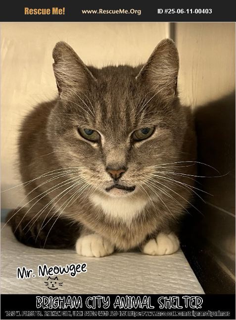Welcome, Mr. Meowgee! Mr. Meowgee is the kind of cat who steals your heart the moment you meet him. A handsome senior gentleman, he's got one adorable little tooth that adds to his charm and a face full of wisdom and sweetness. This mellow boy is simply looking for a place to retire, a soft bed, a sunny window, and a kind human to share his golden years with. He's gentle, calm, and ready to soak up all the love he can get. Senior cats like Mr. Meowgee deserve a cozy place to call home. And for just a $40 adoption fee, you can give this special guy the peaceful retirement he's hoping for. All adoptions are upon approval of the adoption application only Shelter Hours: Tues-Fri 12-6pm Brigham City Animal Shelter 1220 W Forest St, Brigham City, UT 84302 (435) 723-1231 https://www.facebook.com/brighamcityanimals