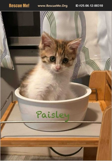 Kittens available for preadoption, and home going is 12-14 weeks once they are spayed/neutered, vaccinated against rabies, tested and microchipped. Meet Paisley - A Splash of Sass and Sweetness! Like her name suggests, Paisley is a beautiful swirl of color, chaos, and charm! This medium-haired calico kitten is equal parts cuddle bug and wild child. She's got that classic calico personality-bold, confident, and full of spunky attitude-but she also melts into your arms for a snuggle when she finally slows down. Paisley is a little fashionista of feline energy-her coat is a work of art, and her personality is just as colorful. She's always on the go, turning every corner into a runway or a jungle gym. If you're looking for a kitten who will keep you on your toes, make you laugh, and then curl up purring by your side, Paisley is your girl. She's independent but loving, playful but affectionate-basically, the best of all worlds in one tiny, fluffy package. Ready to add a little Paisley pattern to your life? She's ready to go go go�'�| home with you!