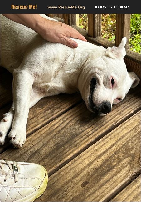 This animal is available to licensed rescue groups only. Please do not enquire unless with a licensed rescue group. My wife and I came across her standing in the middle of the road. She did not know where she was. There was a rope tied very tightly around her neck that she chewed through. She is very scared and deaf. She warmed up to my wife and myself over the last two weeks. She just needs somebody with some time and some love. She is a sweet, sweet girl.