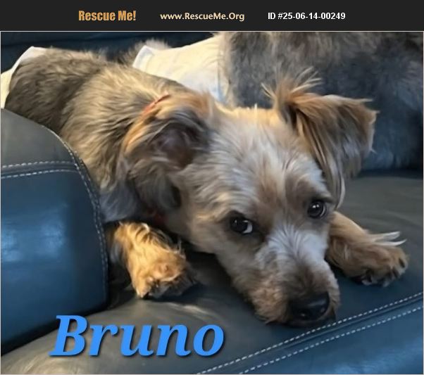 Bruno came to us when his elderly human could no longer care for him. He is a yorkie mix but more medium size than small. He is 2 years old. His foster mom says he is a sweet affectionate boy. He wants to be with his human but is very mannerly about it . Not sure if he has kid experience. He is neutered, vaccinated and microchipped. Message us if you want more information on Bruno.