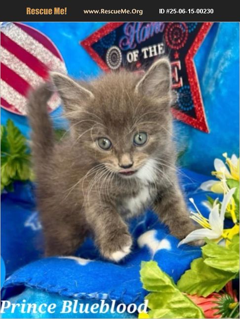 San Antonio, TX. Prince Blueblood is a sweet, fluffy Maine Coon mix kitten about7 weeks old. His hair is super soft and silkie like his Maine Coon heritage. He loves to play, chase things, give and receive affection, cuddle and snuggle. Out of state adoptions welcome.