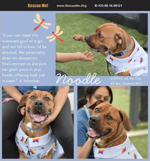 A VOLUNTEER WRITES: ' Noodle ��%8D� if you can meet this oversized goof of a girl and not fall in love, I'd be shocked. Her squishy face and extra jowls and the sweet way she looks at you - enough to melt the coldest heart. Her personality does not disappoint. She's earnest as she puts her giant paws in your hands, offering both just in case. She's silly as she impatiently tippy taps for food (she's underweight and hungry, I'm sure), before hopping up to help you put the treat right in her mouth. She's just beyond lovable. Noodle was found tied to a pole. She's had a challenging time at the shelter and we expect her to go at risk soon. Dogs are her biggest hurdle, and she's reacting to them. Noodle now needs a rescue and a foster home to leave the shelter.Noodle's ID is #228742 and she is at Queens ACC. What my friends at ACC say about me: My history is a mystery and my friends here do not know much about me yet! It is unknown if I have ever lived with other animals or children. I need a home where there are no other dogs. I have been known to shower my favorite people in love! I would do best in a home with only adult humans. I will need daily physical activity to keep me healthy and happy! I am not one to sit still! I will flourish in a home with someone that will keep me mentally and physically active! NOODLE, ID# 228742, @3 Yrs. Old, 62 lbs., Female Queens ACC, Large Mixed Breed, Brown/White Surrender Reason: Stray, 6/3/25 Behavior Assessment Rating: New Hope Only Recommendations: No children under age 13 Single Pet Home Recommend no dog parks. Place with a New Hope Partner Medical Behavior Rating: