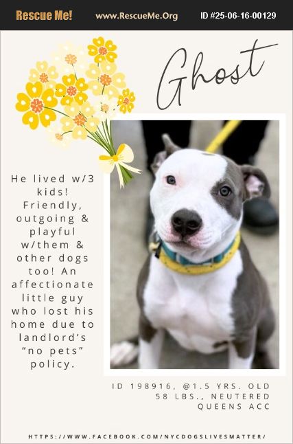 Adopted in May of 2024, returned in June of 2025. And though he has been super sweet, wiggly and friendly with staff, we can only imagine how sad and confused GHOST must be. He was only 7 months old when he was adopted and thought he had found his forever family only to have the landlord say 'no pets,' Now Ghost feels bounced around all over the place and a year older. We feel so badly for him, stuck in the smallest of kennels and filled with puppy energy that he can't run off because he gets only a short bit of time out of that kennel each day. He lived happily with 3 kids and was friendly, outgoing and playful with them and familiar dogs. Affectionate and very sweet, he's a high energy puppy who just wanted to be loved. Ghost loves bath time, he knows the command 'sit' and he is hoping he will find a new and committed family who will love him forever and give him the life filled with joy and happiness he deserves. If you are an experienced foster or adopter, please help this boy out. Ghost is on the at-risk list due to behavior concerns. Ghost has not been acclimating well to the shelter environment despite best efforts to keep him comfortable. In the care center has began to leash bite incessantly inside of his kennel and out on walks, and can not be refocused when he begins doing so making it difficult to walk him safely. Medically, Ghost is apparently healthy. Ghost was brought to the care center by his previous owner because the housing management no longer permitted pets in their home. In the prior home Ghost is noted in the prior home to be social/affectionate, very active and playful and can be lazy/couch potato. He likes to be where people are, in the bedroom and the living room. He loves bath time, allows family to bathe and brush him. In his previous home, Ghost was reported to leash bite and display on-leash reactivity toward other dogs. This behavior has continued in the care center, where he has been observed biting the leash and thrashing while on lead. Ghost is available for rescue through one of our new hope partners. Ghost is an large mixed breed, neutered male dog who has been with the current owner for the past year and it is unknow when he has last been to the vet. He lived with 2 adults, 3 children and 1 small dog. His owner states he will alert bark at strangers and pull towards them and can be mouthy. He's lived with a 8,14 and 15y/o and is tolerant, playful, friendly and outgoing. With familiar dogs he is tolerant, playful, friendly and outgoing, with unfamiliar dogs he will hard bark/growl, lunge and snap at them. Ghost lived with a cat and will hard bark/growl, lunge and snap at them. He will growl if his toys are touched. He has never bitten anyone. Ghost is partially housetrained. His energy level is very high. GHOST, ID# 198916, @1.5 Yrs. Old, 58 lbs., Neutered Male Queens ACC, Large Mixed Breed, Gray/White Owner Surrender Reason: 6/1/25, Landlord no pets policy Behavior Assessment Rating: New Hope Only Recommendations: No children under age 13 No cats. Place with a New Hope Partner Medical Behavior Rating: 1. GREEN