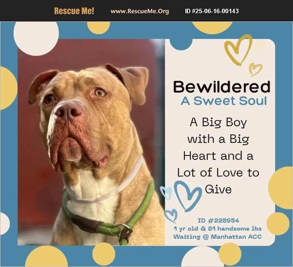 Meet Bewildered - A Big Boy with an even Bigger Heart ���� Why Bewildered Needs You Fearful but Not Hopeless: Bewildered arrived terrified and confused. He's shown signs of extreme fear (flinching, snapping when overwhelmed), but he's also made small, meaningful progress with patient handlers. Already Showing Bravery: In recent interactions, Bewildered has allowed leashing without incident, explored outdoor yards, and cautiously approached people. With a calm environment and a kind heart, he has the capacity to trust. Healthy & Strong: Medically cleared and in good shape-he's just overwhelmed by the shelter setting and needs a quiet, experienced home to decompress. Big Boy, Bigger Heart: This 80+ lb gentle giant isn't aggressive-he's scared. He flinches from touch and fast movements but shows no interest in conflict when given space and understanding. ���� Who He's Looking For ���%8D Adult-only home-no kids ��%90 New Hope Partner placement required �٤%A0 Patient, dog-savvy person with experience in fear-based behavior and a commitment to positive reinforcement training ���%8F��%8F A foster or adoptive home where he can decompress, rebuild confidence, and learn people can be safe �%9D%A4��%8F Why He's Worth It Bewildered didn't choose to end up in a loud, chaotic shelter. With no known history, no familiar face, and no safe space to call his own, his reaction is understandable. But even through his fear, he's shown signs of trust. He wants to connect-he just needs someone to help him feel safe enough to try. ��%90%BE Help Bewildered Find Peace Please consider fostering or adopting through a New Hope Partner. His story is just beginning, and you could be the chapter where hope finally enters his life. Bewildered ID #228954 Male tan dog At the Manhattan Animal Care Center About 1 years old Weight: 81.6 lbs Surrendered as a agency on 6/6/2025. Status: New Hope Partner Placement Only