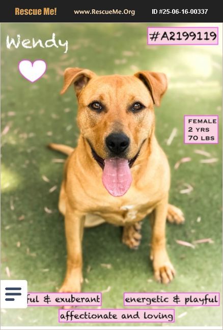 URGENT!!! Wendy, A2199119 Put on The Urgent List due to High FAS (fear anxiety stress)!!! Animals in our care are struggling and are being placed on urgent alert because they need more out-of-kennel enrichment and socialization with people and other pets. These pets are available for adoption and foster through LAAS, but they are decompensating emotionally and physically. Long-term sheltering is not an option for these pets without significant improvement in their emotional and physical well-being. Please consider taking these pets ASAP. Pets who continue to decompensate or significantly worsen may be placed on the euthanasia alert. Wendy- Spayed Female- 2 yrs old- 70 lbs- Possible Owner (Lakewood)-05/21/25. Wendy is experiencing High FAS in her kennel. Outside of the kennel she has been able to be taken out by volunteers. She has participated in a playgroup with a muzzle. Delicia Hernandez Life Saving Liaison & Foster Coordinator Animal Care Technician Los Angeles Animal Services Harbor Animal Shelter 957 N Gaffey St San Pedro, CA 90731 Cell: (213) 605-4473 Shelter: (310)548-2632 E: [email protected]