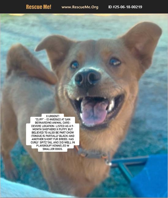 Courtesy Posting: X URGENT AT HIGH KILL SHELTER- DEVORE, CA, So Cal 'CLIFF' - ID #A820622 AT SAN BERNARDINO ANIMAL CARE- DEVORE LOCATION- listed as a 9 MONTH, 21 LB PUPPY, but believed to be part CHOW (tongue is partially black) and another short fur breed LIKE JINDO (mislabeled and overlooked as a shepherd). HAS A CURLY SPITZ TAIL and DID WELL IN PLAYGROUP! KENNELED W SMALLER DOGS. NEEDS OUT ASAP. WONDERFUL, ADORABLE PUPPY READY FOR A LOVING, FOREVER HOME, OR A FOSTER AND RESCUE ASAP - SHELTER IS FULL, HIGHER KILL Help! The shelter is asking for help for this friendly boy findly named Cliff who is described by them as 'DOG IS EASILY HANDLED AND DID VERY WELL IN PLAYGROUP ON 6/9/2025. Dog is Bright, Alert, and Responsive. Is eating and drinking within normal limits. Was sent to get neutered, surgery site is clean and dry and e-collar is still intact.' We also have nice video of him doing well with his smaller kennel mates who seem to be unrelated. They too need a good home but may be adopted separately. Cliff was just neutered, vaccinated, microchipped and is ready for a good home. He needs out of the shelter before he declines in the shelter and is added to their euth list suddenly. Until now, he has been totally overlooked because he is likely mislabeled as a shepherd mix. He is only 21 lbs, has a blackish tongue, short fur and a very curly spitz like tail. He looks like a chow jindo mix. For direct adoption or rescue inquiries for adorable Cliff, please contact the shelter asap at (909) 386-9820 and provide his ID. If you are a rescue, please email the shelter directly at: and also emails as [email protected] Cliff's listing link to check status is: https://24Petconnect.com/DetailsMain/SBCO1/A820622 Since rescue groups likely need a foster to save, if you are interested in fostering, please contact [email protected] asap or Southern California Chow Chow Rescue Network who is trying to assist the shelter with his placement, and we can try to pair you with a rescue to help or foster or adopt through. We will also be posting updates, additional pictures and videos on facebook at: https://www.facebook.com/debbie.alder.14/posts/pfbid0bc6h1VdobvpV3JgQDuhUgy1EmV7UrcrYD8EPtwDhFJND2bbE9cF9kr55NzGWsK2Al Note: to view contents of links you will need to copy and paste each one separately into your browser.