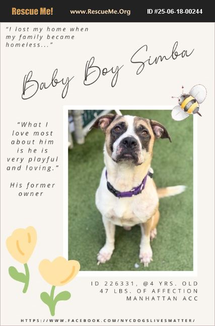 He is at the shelter through no fault of his own, a sweet, affectionate, playful 4 year old boy who has only known the joys of family life. He lived with and loved a child and another dog, was playful with dogs outside the home, is house and crate trained but didn't like baths or nail trims. Well, no one is perfect! His parent said the thing they loved most about BABY BOY SIMBA (aka Simba) is he 'is very playful and loving.' But when his family suffered housing insecurity, Baby Boy Simba was sent to the shelter. His intake was heartbreaking, with staff noting 'Simba began pacing rapidly around the lobby with a tucked tail, tense body, whimpering and unable to settle. He was receptive to the sound of squeaker toy at first, but then became fixated on watching his owner leaving.' We can't imagine the pain of that for both Simba and the person he loved. It's now been over a month, and not a single nibble from potential fosters or adopters. He remains lonely and unwanted. Let's change that, shall we? Please begin sharing Baby Boy Simba (what a mouthful) for a family. Baby Boy Simba (previously known as Simba) came to MACC an owner surrender due to housing insecurity. He was with his parent for 4 years. Simba lived with 1 adult, 1 child (Age 13), and 1 other dog (medium mixed breed). Around strangers Simba is tolerant; he is shy and likes to make contact on his own terms. BABY BOY SIMBA (fka Simba), ID# 226331, @4 Yrs. Old, 47 lbs., Male Manhattan ACC, Medium Mixed Breed, Tan/White Owner Surrender Reason: 5/5/25 - Housing insecurity Behavior Assessment Rating: LEVEL 4 Recommendations: No children under age 13 Medical Behavior Rating: