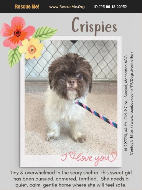 If CRISPIES feels overwhelmed and terrified she has every reason to me. Police found her and another small dog, completely abandoned. Next to Crispies was a handwritten note that said 'Bites'. The responding officer confirmed neither dog had bitten or scratched anyone, but that poor little Crispies was just growling at strangers. Imagine being only 9 lbs. and left entirely alone in the big wide world! And if that trauma wasn't enough, a week later at the shelter on the way back from time in the play yard, she started to thrash on the scary slip lead (a lot of dogs do - it's like a noose!) and she managed to break free and ran back up the staircase trying to run to freedom and find her home, only to get cornered by the ACS person who tried to grab her, and of course in her fear, she reacted. Our hearts hurt for this little one. She desperately wants to feel safe, she doesn't know why her family abandoned her and her sibling, and she just wants to go home! What Crispies needs now is an experienced small dog family who understand what it means to feel very small in a very big and scary world. A quiet, calm, low traffic home where she can decompress and open her heart again to love. Behavior toward dogs: Crispies was found with another dog but there is no info on how they behaved together CRISPIES, ID# 227790, @4 Yrs. Old, 9.7 lbs., Spayed Female Manhattan ACC, Small Mixed Breed, Chocolate/White Owner Surrender Reason: 5/23/25 - Stray Behavior Assessment Rating: New Hope Only Recommendations: No Children under Age 13 Place with a New Hope Partner Medical Behavior Rating: 2. BLUE!