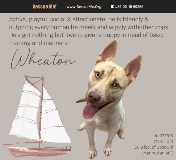 Oh for God's sake, WHEATON is just an active, enthusiastic, high energy puppy! He wants to give jump up hugs to every single person he meets. He has nothing but goodwill and love in his heart for humans and other dogs (he wiggles away when he meets his doggy peers!), and if he needs anything it is basic training and manners. He doesn't know he is doing anything wrong, he just knows if he gets excited when he runs into someone (friend, stranger, visitor, you name it) he can flop down, present his belly, and pray that someone will give him a bellyrub. Yes,he needs leash manners, 'graceful greetings' training, and some calming commands like 'down' and 'place' so he can redirect that happy (or anxious) enthusiasm in a positive way and not knock friends over, but that is certainly NO reason to die. We want this adorable, affectionate, social and playful boy to have a long and love filled life (we think he has husky in him because he loves to 'talk' with his howls). Please don't let this kid perish. He needs an experienced, active, fun family who will engage him in training (he is eager to learn and loves treats!). Wheaton is an approximately 12 month old, medium mixed breed, male dog who arrived at the shelter an owner surrender. He was with his owner for the past couple months. It is unknown when Wheaton was last seen by a vet. Wheaton lived with adults. He is playful, friendly and outgoing with strangers and visitors, but will jump up non-stop. Wheaton has spent time around children of various ages and is playful, friendly and outgoing. When on walks when he sees dogs he will whine and will pull towards them and is friendly and outgoing. Wheaton has not spent time around cats so behavior is unknown. Wheaton will hover over his food bowl when touched with a tense body. He is partially housetrained. His energy level is very high. Wheaton, ID# 227703, @1 Yr. Old, 56.8 lbs., Male Manhattan ACC, Medium Mixed Breed, Blonde Owner Surrender Reason: 5/23/25 - Stray Behavior Assessment Rating: Recommendations: No Children under Age 13 Medical Behavior Rating: 1. GREEN!