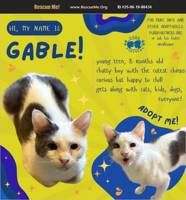 Meet Gable! ��%90%BE Gable is a sweet and playful teenage kitty with a heart full of love and tiny squeaks of joy just for you. This adorable guy is very polite, litter box trained, and gets along wonderfully with cats, kids and dogs. On top of that, he has the cutest meows you've ever heard. He's social and curious, always ready to explore or follow you around - but he's also patient and gentle, happy to just hang out and make biscuits by your side. Whether he's greeting you with soft chirps or charming you with his playfulness, Gable is sure to make your home warmer and happier. ���� Ready to meet your new best friend? Gable's waiting!