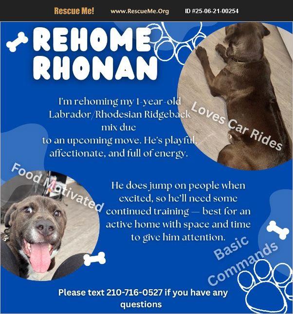 Hello! As shown in the photo, I'm looking to rehome my sweet boy, Rhonan. I'm moving back to my home state and unfortunately can't take him with me. Rhonan is a loving, playful dog who shows affection through lots of kisses. He's full of energy, enjoys the outdoors, loves car rides, and - most of all - is incredibly food motivated! He knows basic commands like 'sit,' 'lay down,' 'come here,' and 'stop.' While he can get a little too excited and sometimes jumps up on people, he has a big heart and means well. He's been to the dog park and does well around other dogs and people. He's up to date on all his shots. I'm hoping to find him a loving home where he can continue to thrive and be his happy, goofy self.