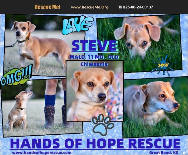 Meet Steve, probably one of the cutest little Chiweenies you will ever meet! Steve is 11 months old and came in with his dad Jim. We are told he is full Chiweenie. Steve is a active young playful pup who loves kids and does fine with other dogs. We are unsure about cats. He love to cuddle as much as play too! Steve is crate trained and does well in the house most of the time but does have his Chihuahua moments where he will decide the house is just fine. Overall, he does pretty well! Steve is current on vacs, neutered, microchipped, heart worm tested and kept on monthly preventatives. To apply to bring this adorable guy into your family visit our website at www.handsofhoperescue.com and fill out an application.