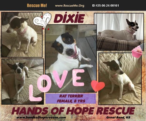 This adorable little gal is Dixie! She is a 7year old female terrier mix. Dixie is looking for a special home with patient humans. Dixie has high anxiety and is very skittish. She'll growl and show her teeth when she's scared so a calmer home is preferred. She will bit if she is continually pushed so a home with no small kids is a must. Despite this, she is a super sweet dog who craves human love. Although Dixie tolerates the other dogs in her foster home, she would prefer to be an only dog so she can have all the attention. She desperately wants to be snuggled and feel secure. Dixie would be the perfect companion in a quiet, adult-only home. DIXIE'S ADOPTION FEE IS SPONSORED FOR THE RIGHT APPLICANT!! Dixie is spayed, current on all vaccinations, heartworm negative, and is kept on monthly heartworm and flea prevention. To adopt you MUST fill out an application which can be done on our website at www.handsofhoperescue.com.