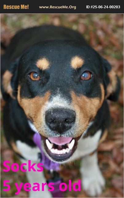 Socks is a 5 year old that appears to be a Greater Swiss Mountain Dog/ Dobie mix girl that was rescued from a hoarding situation and is just learning what it truly means to be a dog. Socks is such a sweetheart and eats up praise. She is smart and has learned basic commands at the rescue. She was one of many that was heartworm positive when rescued but has been treated and is ready to start her new life! She has been spayed, vaccinated, dewormed, and is heartworm negative now! Her adoption fee is $250.