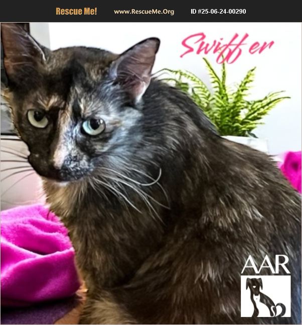 Swiffer is a dark beauty adult cat with big green eyes. (Her foster feels Swiffer needs a more sultry name like Sophia or Raquel!) Swiffer may be a little shy at first but with some gentle encouragement she will be a lovebug. We don't know what happened to her before she came to AAR but she is very appreciative of any kindness. She likes quiet time, pets, Sheba pate, and a warm comfy bed.