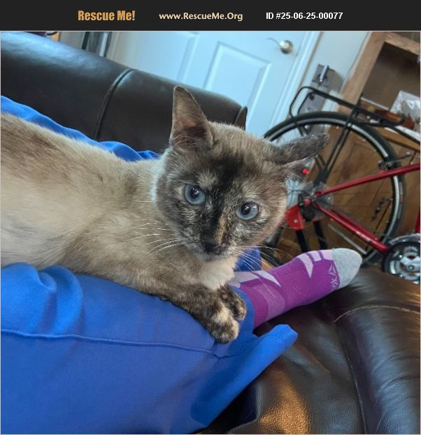 Beautiful loving part Siamese. Definitely wants to be someone's lap cat and an indoor cat. Submissive to other cats, tolerates dogs as long as they are tolerant of her. Immediately jumped in my neighbor's lap but has not been around children. I can't imagine there would be a problem. Please contact for more pictures or questions. :)