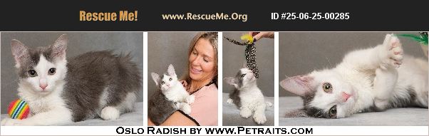 Oslo Radish is a magnificent, golden-eyed, gentle, sweet, snugly and playful, four-month-old, male grey and white long-haired kitten looking for a loving guardian. Oslo loves other cats and people of all ages. He's fun, bold and brave and is looking for a home with at least one other cat to play with. Abandoned in a cage in the forest preserve in Park Ridge, Illinois, he's lucky to have been found by someone walking their dog. Oslo holds no grudges and judgement for those who endangered his life (but I do). And, he is just the sweetest kitten I've ever met so someone must have treated him kindly before he was dumped. He is now very healthy, neutered, and virus-tested negative, dewormed, vaccinated for distemper, microchipped and ready for a loving home for life! His foster mom calls him 'Mr. Magnificent' if that tells you anything. He is a gem �'�| so sweet and soft to the touch, and a sweet soft attitude. He loves all toys and all cats. We don't know about dogs. To meet and possibly adopt Oslo Radish, please fill out an adoption application https://friendsofpetraits.com/cat-adoption-application/ After the application is complete, please contact [email protected] to schedule an appointment to meet him. His adoption fee of $175 benefits the Friends of Petraits Rescue. He is currently being fostered in Chicago's Rogers Park Neighborhood.
