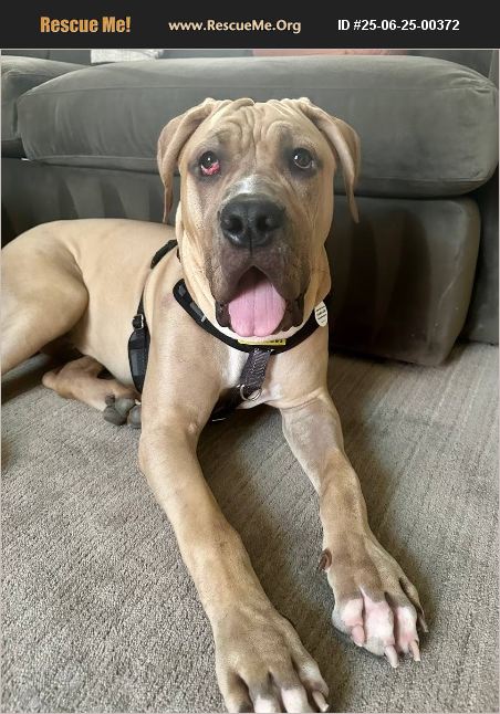 Meet Velvet! Velvet is a sweet, goofy pup with a heart as big as his paws. At just 10 months old, this Cane Corso is still learning that the world is a safe place. He can be fearful of strangers at first-but once you earn his trust, he becomes a total lovebug who'll smother you in kisses and flop right onto your lap (personal space? Never heard of it). Velvet has a high energy level and loves food puzzles, snuffle mats, chew toys, and following his person around like a shadow. He's very affectionate and can be a bit needy-but in the most endearing way. He's great on leash, mostly house-trained (just needs a little consistency), and sleeps peacefully through the night in his crate (even if he grumbles about going in). Velvet recently had cherry eye surgery. The procedure was successful on one eye, but the other may not return fully to normal-though it doesn't seem to bother him much! He's also starting training with his foster to help build confidence and manage his anxiety, and he's already making progress. He's good with other dogs-he previously lived with one-and he recently had a walking playdate with another pup that went really well! While he may bark at dogs from the car, he doesn't react to them on walks and is continuing to learn positive social behaviors. Velvet already knows several commands (even if he's sometimes stubborn about following them!) and is picking up more every day as he heals and grows. If you're patient, loving, and ready to help a young pup blossom, Velvet will reward you with loyalty, laughter, and a whole lot of snuggles.