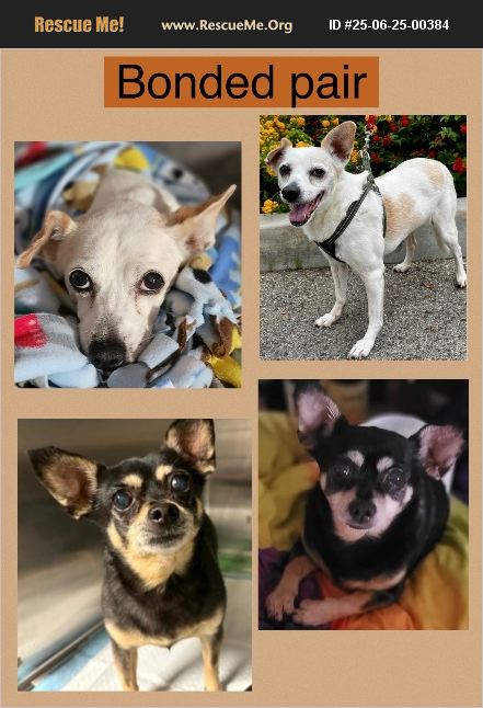 Bonded Chihuahuas, A1497854, 'Niko' & A2198178, 'Brookie' at West Valley Shelter, In Foster Care. Brookie and Niko are a sweet, bonded pair who were dumped at the shelter together. Thankfully, there are being fostered by one of the staff and are not being subjected to the stress of being a senior in the shelter. But they do need a rescue, and they do need to stay together. Brookie is a spayed female, believed to be about 10 years of age. At 16.9 pounds, she is a chunky monkey! Her body condition score (BCS) is 7, and the ideal BCS is 5. Brookie has heavy tartar and overgrowth of her gums on the left upper side. She has multiple discolored growths on her ventral abdomen. They also feel she has a heart murmur. Niko is a neutered male, believe to be about 12 years of age. Niko weighs 13 pounds. His body condition score is 8. Niko has a luxated patella on his right hind leg. Both dogs are coughing. At first, it was suspected they have upper respiratory tract infections. Although not diagnosed, I suspect they BOTH have heart murmurs. Our foster reports that they are great with other dogs in the home and even respectful of cats in the home. Let's make some magic happen for these seniors, so that they do not spend one single night in the shelter and not one single night away from each other!! BROOKIE #A2198178 https://24petconnect.com/DetailsMain/LACT5/A2198178 NIKO #A1497854 https://24petconnect.com/DetailsMain/LACT5/A1497854 Los Angeles West Valley Animal Shelter 20655 Plummer Street Chatsworth, CA 91311 Phone: (818) 756-9325