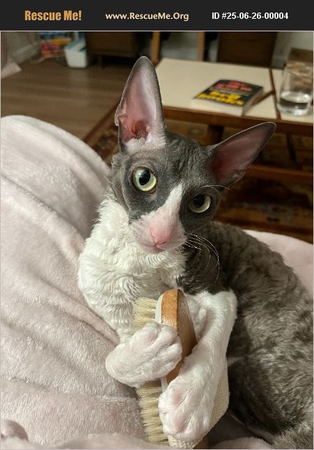 Sylvia is a 4.5-year-old Cornish Rex with a huge heart and an even bigger personality. I adopted her from a rescue three years ago, and she's truly the sweetest cat I've ever known-gentle, affectionate (on her terms), playful, curious, and endlessly people-loving. She's tiny (just 7 lbs), vocal, and full of quirks: she drinks from glasses like a human, adores being chased around the house, and has a deep love for measuring tapes, pom-poms, hairties, and sunny windowsills. Sylvia thrives on human interaction and attention-she'll happily chat with you throughout the day, rub her face against anything that makes noise, and follow you from room to room just to be near you. She's litterbox trained, prefers soft corn litter due to her front declawing (done prior to adoption), and only eats fish in gravy, but also enjoys salmon kibble, Greenies and Churu treats. Unfortunately, Sylvia struggles with separation anxiety. My remote job has become increasingly demanding, with frequent travel that causes her stress-when left alone too long, she may occasionally go outside her litterbox, seeking soft surfaces for comfort. She doesn't self-entertain easily and needs a person (or people) around during the day to help her feel secure and engaged. This is an incredibly difficult decision, but I've come to realize I can no longer give Sylvia the stability and attention she needs. I'm looking for a calm, loving home-ideally with someone who works from home without regular travel, and either has experience with Rexes or understands that this breed is more interactive, sensitive, and high-maintenance than most cats. A home with multiple people (kids welcome!) or even another friendly cat could be ideal. Serious inquiries only-I will be vetting adopters through references, a meet-and-greet, and a home visit. My priority is finding a home where Sylvia can thrive, feel safe, and be adored the way she deserves.