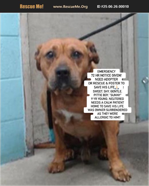 Courtesy Posting: EMERGENCY, 72 HR NOTICE GIVEN FOR ADORABLE, SWEET, GENTLE, SHY PITTIE BOY 'Sunny #A5703398' @ DOWNEY COUNTY SHELTER - WHO WAS OWNER SURRENDERED DUE TO THEM BEING ALLERGIC TO HIM! HE IS 9 YRS YOUNG, 78 LB, NEUTERED AND NEEDS A PATIENT, CALM, LOVING HOME OR FOSTER & RESCUE TO SAVE HIS LIFE! WHO CAN HELP HIM PLEASE? SUNNY - ID #A5703398 Downey County Shelter, Downey, So Cal https://24Petconnect.com/DetailsMain/LACO/A5703398 EMER 72 Hr Notice was given and this pup URGENTLY needs a loving home or solid foster & rescue to save his life!!! Sweet Sunny looks heartbroken as his owners surrendered them because they were allergic. Apparently, they have not heard of the use of antihistamines to address this issue! Sunny is 9 yrs young, neutered, gentle, shy and needs a calm, patient forever home to save his life! Please someone save him, how can you resist his adorable face? ��%BD��%BD%BD��%BD��%BD%BD%90��%BD��%BD%BD Personality: Sunny is a sweet but shy pup who needs a little extra time to come out of his shell. In new or unfamiliar environments, he may crouch or keep his distance. His body language-tense posture and stiff muscles-shows he's feeling unsure. But don't let that fool you! Sunny is gentle, non-reactive, and never aggressive. With a go-slow approach, he'll begin to warm up and even seek out calm, reassuring interaction ��%BD��%BD%BD��%BD��%BD%BD��%BD��%BD%BD��%BD��%BD%BD Ideal Home: Sunny will thrive in a calm, patient environment where he can build trust at his own pace. If you're the kind of person who lets dogs come to you and understands that love is earned, Sunny could be your perfect match ��%BD��%BD%BD��%BD��%BD%BD%90 Notes from Previous Owner: ��%BD��%BD%BD��%BD��%BD%BD�����%BD%BD%8F Good with large dogs ��%BD��%BD%BD��%BD��%BD%BD%90��%BD��%BD%BD��%BD��%BD%BD'��%BD��%BD%BD%8D��%BD��%BD%BD��%BD��%BD%BD|��%BD��%BD%BD ��%BD��%BD%BD%9D��%BD��%BD%BD Not good in the car ��%BD��%BD%BD��%BD��%BD%BDs��%BD��%BD%BD ��%BD��%BD%BD��%BD��%BD%BD�����%BD%BD%8F Walks nicely on a leash ��%BD��%BD%BD��%BD��%BD%BDs ��%BD��%BD%BD��%BD��%BD%BD%90��%BD��%BD%BD May bark while on leash ��%BD��%BD%BD��%BD��%BD%BD��%BD��%BD%BD%A4 Low energy and enjoys relaxing Downey dogs needing rescue Trello board link click��%BD��%BD%BD%A0 https://trello.com/b/rOqYqMYR/downey-dogs-needing-rescue If you are interested in adopting this sweet boy or if you need more information, please call the shelter directly at: (562) 940-6898 and refer to his ID number. Per their website, the shelter is open for ACC Visitation and Adoption Hours seven days a week with the following hours: Monday - Saturday 11:00am to 5:00pm Services include adoptions, lost and found animals, animal licensing, and general pet assistance. Sundays and Holidays: Limited services. Rescue partners interested in pulling this cutie: IF YOU HAVE PLACEMENT: PLEASE EMAIL DOWNEY ANIMAL CARE CENTER STAFF @DACC Downey Rescue [email protected] We have a sweet video of him also on his FB post at: https://www.facebook.com/debbie.alder.14/posts/pfbid02HdFjVMAjZmxrUBapgNf9A2tZFtfBbkwtRgWStQoKyn9fR883GaSELwQYbhcWaNYnl Note: to view contents of links you will need to copy and paste them separately into your browser.