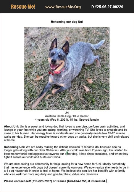 Uni Australian Cattle Dog / Blue Heeler 4 years old (Feb 6, 2021), 45 lbs, Spayed female About Uni: Uni is a sweet and loving dog that loves to exercise, perform brain activities, and lounge at your feet while you are eating, working, or watching TV. She loves to snuggle and be close to her human. Her energy level is moderate and she generally needs two 15-20 minute walks per day. She can be reactive toward other dogs on walks, but she is very chill and relaxed at home. Rehoming Uni: We are sadly making the difficult decision to rehome Uni because she no longer gets along with our older Shiba Inu. After our child was born 2 years ago, Uni started to become territorial and aggressive towards our other dog. It has since escalated, and when they fight it scares our child and hurts our Shiba. As a result, we are now looking for a new home for Uni.