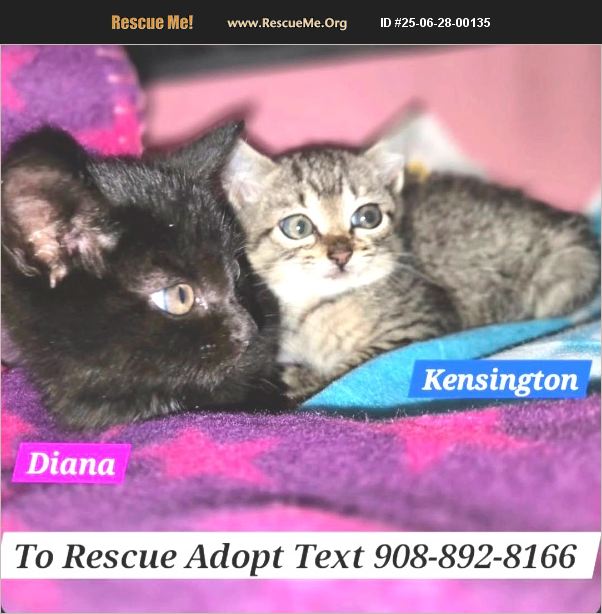URGENT! Save Diana & Kensington! These tiny homeless rescue kittens urgently need an Adopter to Save Them! They are brother & sister and would Love to Stay Together, but they are available for adoption separately or together. To ADOPT please TEXT MESSAGE 908-892-8166