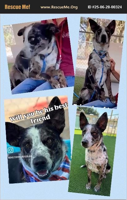 Otis is in a high kill shelter in Castaic, California. Please give this sweet, handsome boy a loving home that he's so deserves and really needs!! Transportation information is available. Otis (A5703399), is one of the sweetest dogs I've ever known. A 2-yr-old Australian Cattle dog that came in as a stray, he's social with other dogs, shy at first but warms up quickly to nice people, affectionate, learning basic obedience skills and aims to please. He'll thrive with a gentle touch and the comforts of a loving home. Video: https://www.facebook.com/reel/652105797841328/?fs=e&mibextid=wwXIfr&fs=e