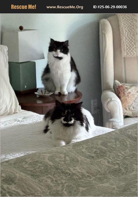 Finn and Penny were adopted in 9/23 as young kittens but, sadly, due to many personal issues and the adopter's current job status they need to find a new home. This brother and sister bonded pair of cats would be a great addition to any home. Finn (the boy) is the one with the black nose. He is very sweet but, more on the shy side. He loves to chase his plastic springs and fuzzy balls. He loves to greet you in the morning with his sweet chirps. He and his sister do not meow they chirp to each other (their secret language). Penny is a sweet girl, and is very friendly. She likes to sit on her lounge chair in the living room when you watch TV in the evening. Penny and her pink nose and fluffy tail makes her the perfect kitty. She is the first to her food bowl in the morning. She is also a huge fan of her cat dancer. Both kitties love looking out the windows and watch the birds and squirrels. They love their scratching post and pads. They are great with their litter box and not clawing the furniture. There is no problem with having their nails clipped and being groomed. Currently living in Annapolis, MD while we seek a local foster home. Contact www.hafr.org for more info/photos