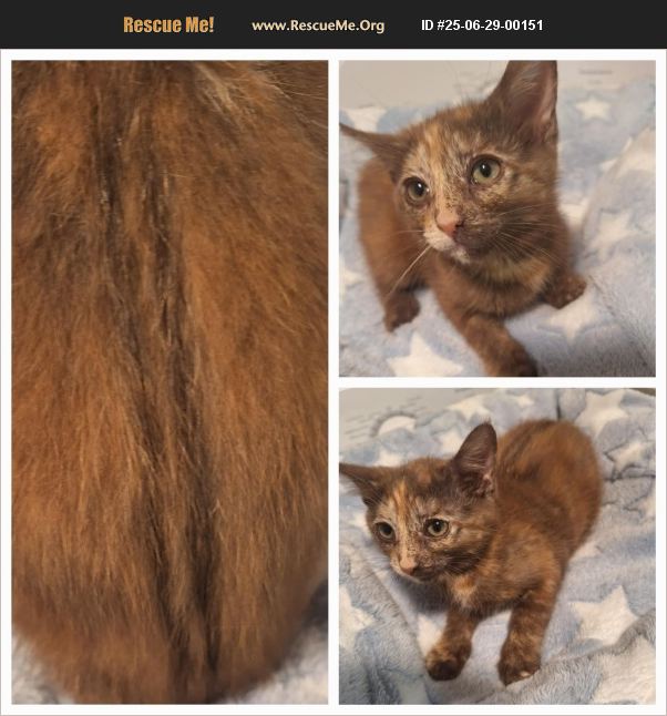 Glory, DOB, 4/25/25, 8 weeks old. Sweet kitty with very unusual colorings. A vibrant rusty color with black stripes down her back. Up to date on shots and worming. ......At Tails of the Forgotten Paws we strive to find the best forever home for all of our Rescue Pets. Because we want the very best for our dogs and cats we have tried to answer any questions you might have on our Web Site's FAQ section and you can also check out our Face Book page for more information. Or email us at----- [email protected] ----- To fill out an Adoption Application please go to-----https://www.tailsoftheforgottenpaws.org/----