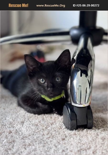 Species: Cat Sex: Male Breed: Domestic Color: Black Birthday: May 12, 2025 Weight: 2.2 lbs Litter Box Trained: Yes Neutered: No Vaccinated: Yes Good with Dogs: Unknown Good with Cats: Yes Good with Children: Unknown This handsome black kitten, born May 12th and weighing just over 2 lbs, is the perfect blend of playful and affectionate. He might be a little shy at first, but once he warms up, he'll claim your lap as his throne and happily soak up all the full-body rubs and kisses you can give. He's a vocal boy in the best way - he'll let you know when it's time for love, play, or a refill at his favorite cat water fountain. When he's not curled up on you, he's all about chasing balls, wrestling with kicker toys, or pouncing on his wand toy prey. He's litter box trained, vaccinated, and gets along well with other cats. Saved by kind humans after his mom was hit by a car, this sweet kitty just needs a patient, loving forever family to help him blossom into the confident cuddle buddy he's meant to be. If you're looking for a gentle companion who'll fill your days with purrs and playful antics, he might just be your perfect match. ���%A4��%90%BE
